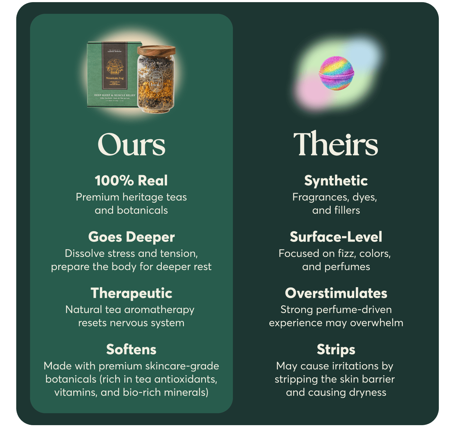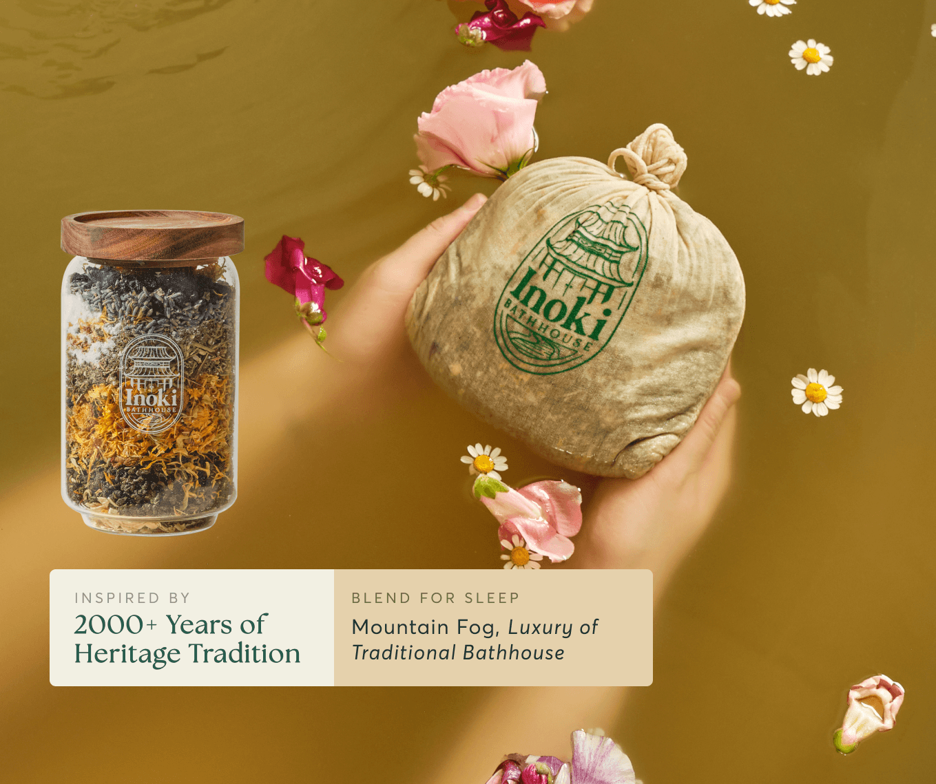 Most bath products rely on foaming agents, dyes, and fragrances. Inoki Bathhouse doesn’t. We handcraft our baths with real botanicals, restorative minerals, and premium teas that deliver true aromatherapy while infusing the skin with nourishing plant nutrients for a rejuvenated glow.